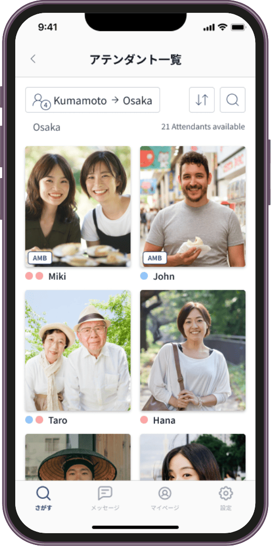 利用人数、訪問する都市を選択してアテンダントを検索してください。